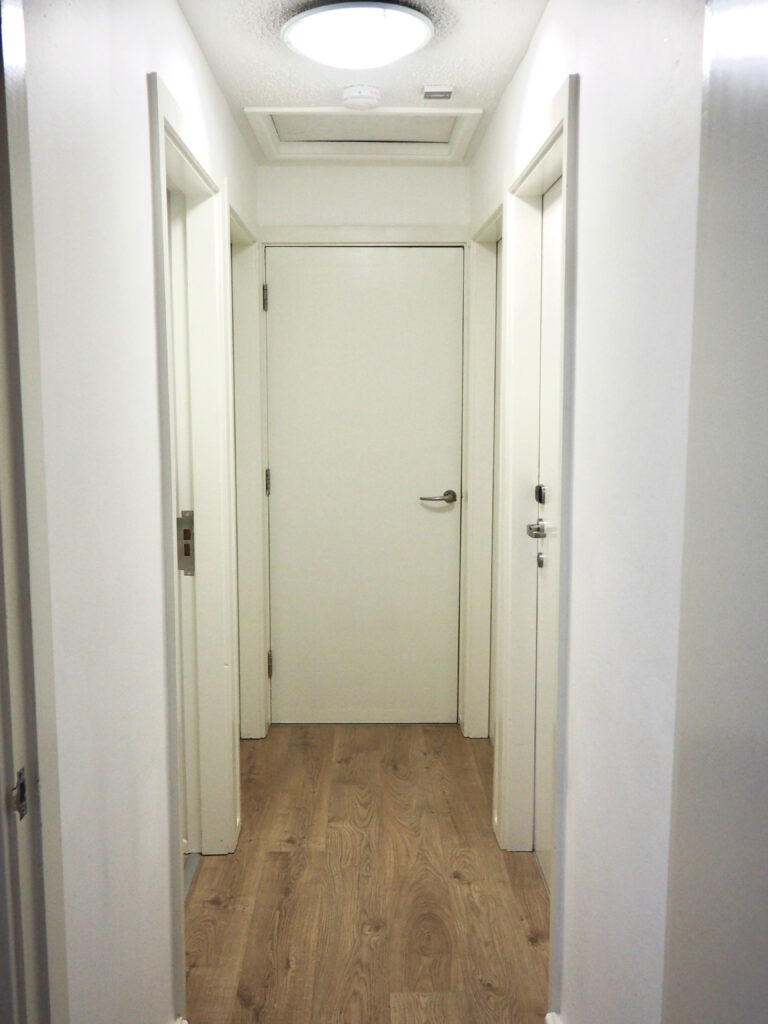 At the end of the hallway is a closet where the boiler and mop are stored. On the sides of the hallways are individual rooms.