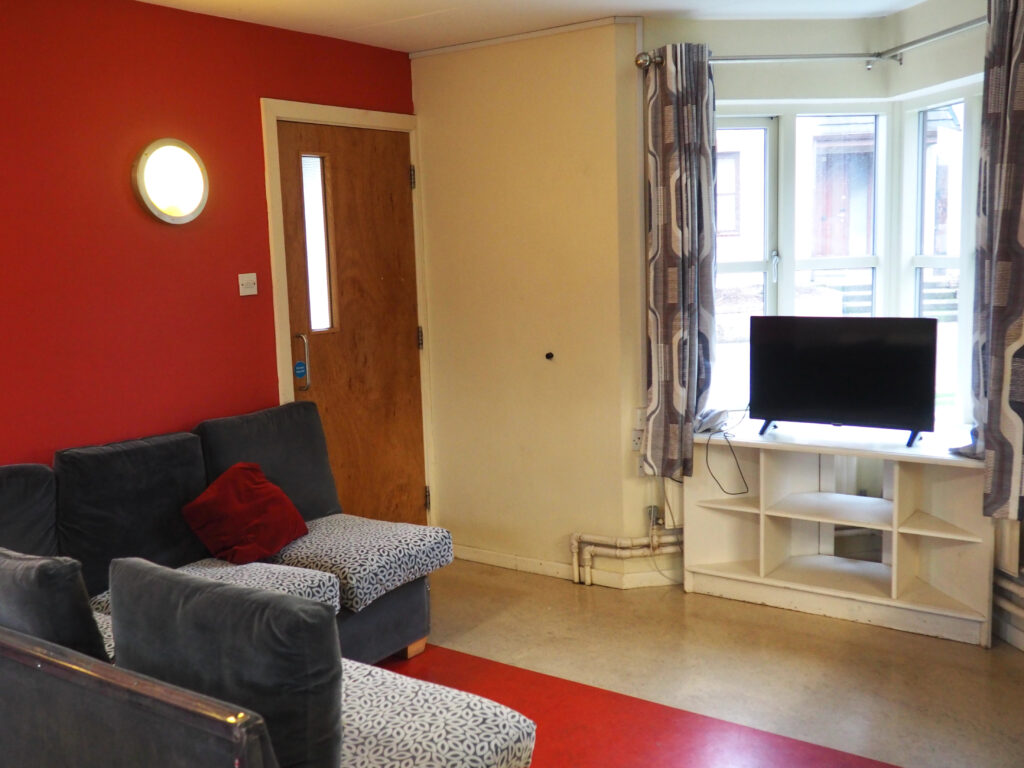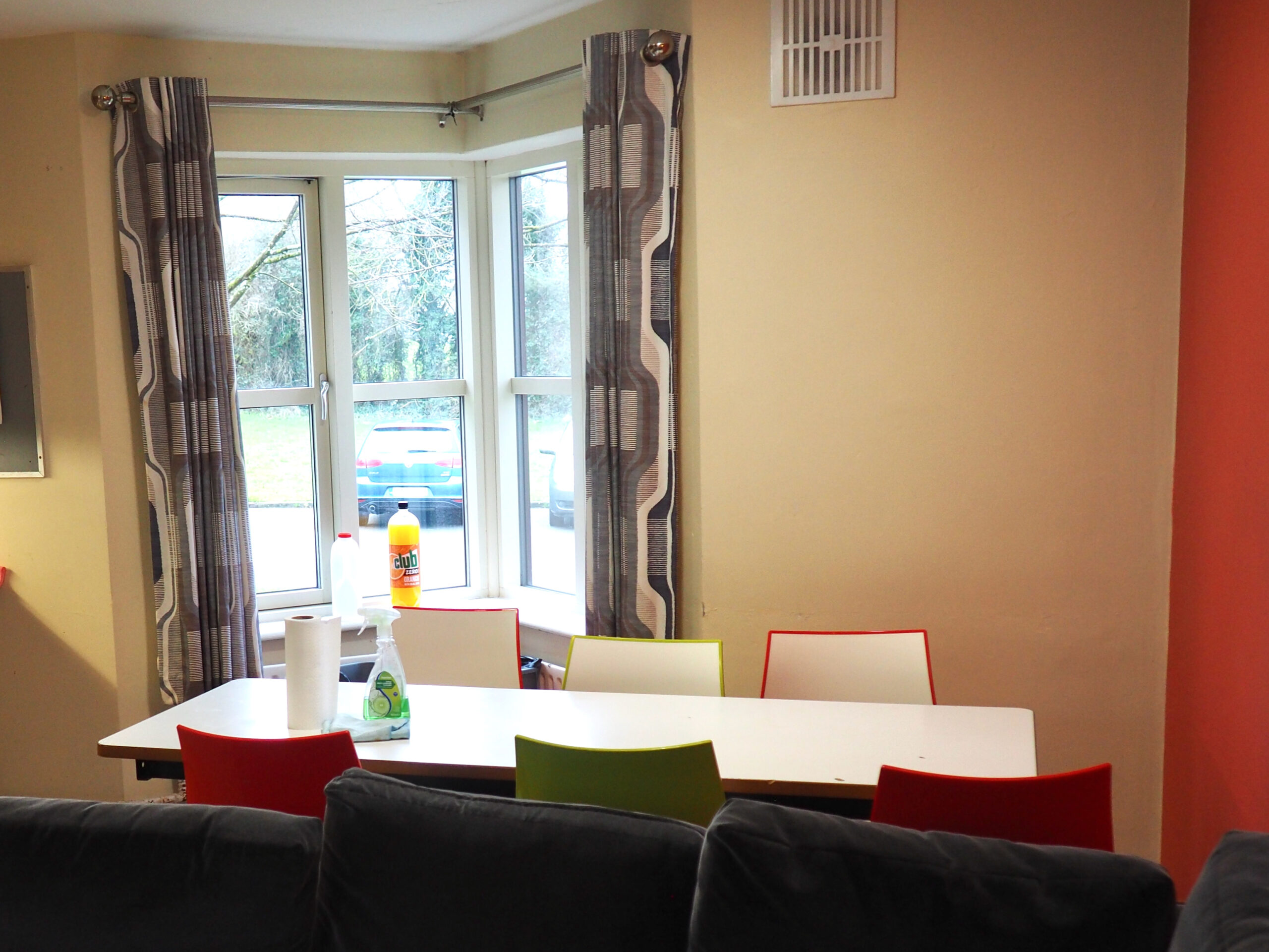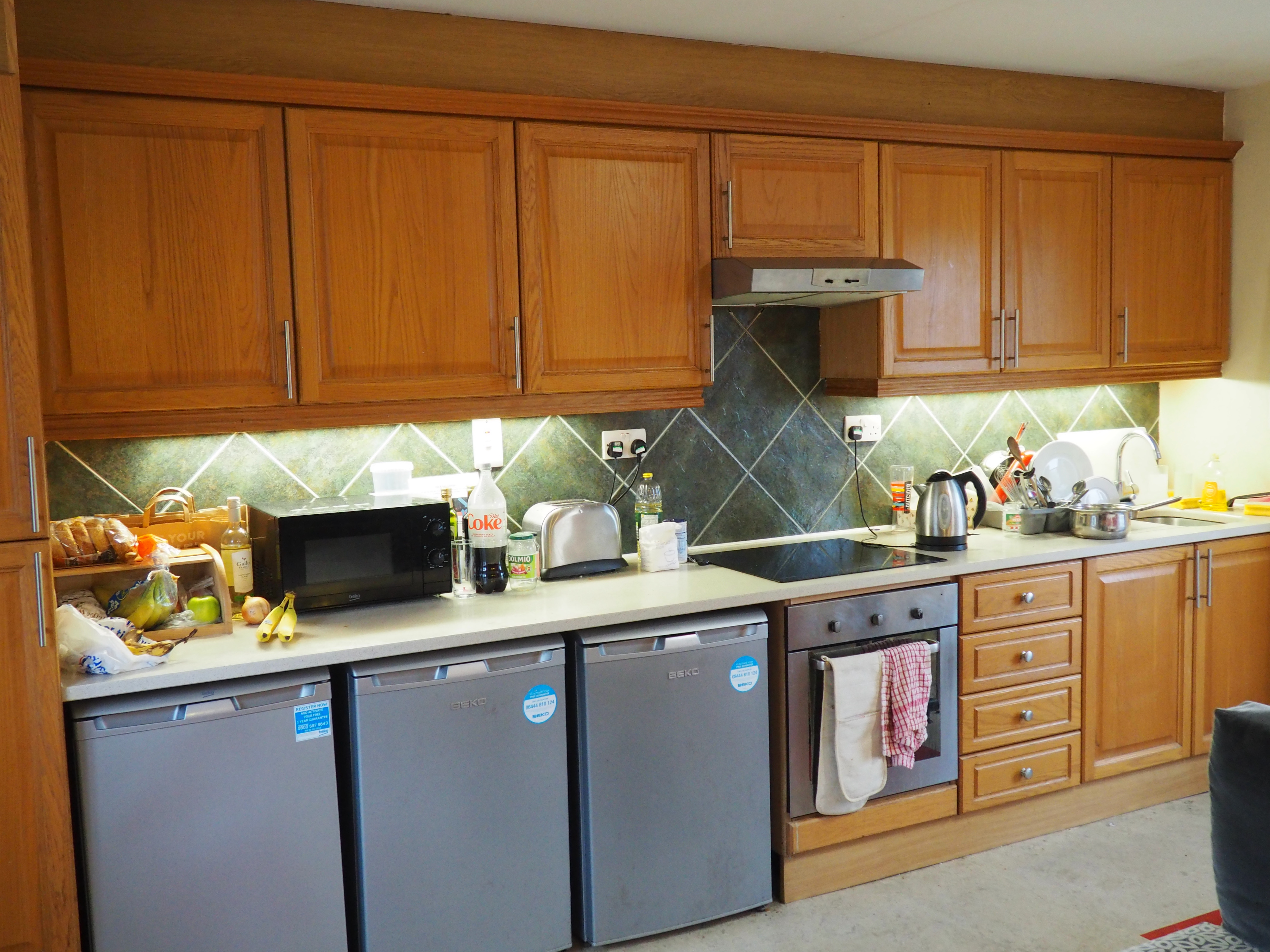 The kitchen has cabinets that can store food, cabinets for dishes that were provided by the University, a bread box, microwave, toaster, kettle, sink, a mini freezer, two mini fridges, an oven, drawers for the cutlery provided, and a cabinet under the sink for a few pots and a pan. There is a table and six chairs at the back of the room. At the front of the room is an L-shaped couch and a TV. It can get a little tight in the kitchen when several of us are in the room at one time. The fridges get full at the beginning of the week as four people find places for groceries. Overall, it is a nice kitchen.