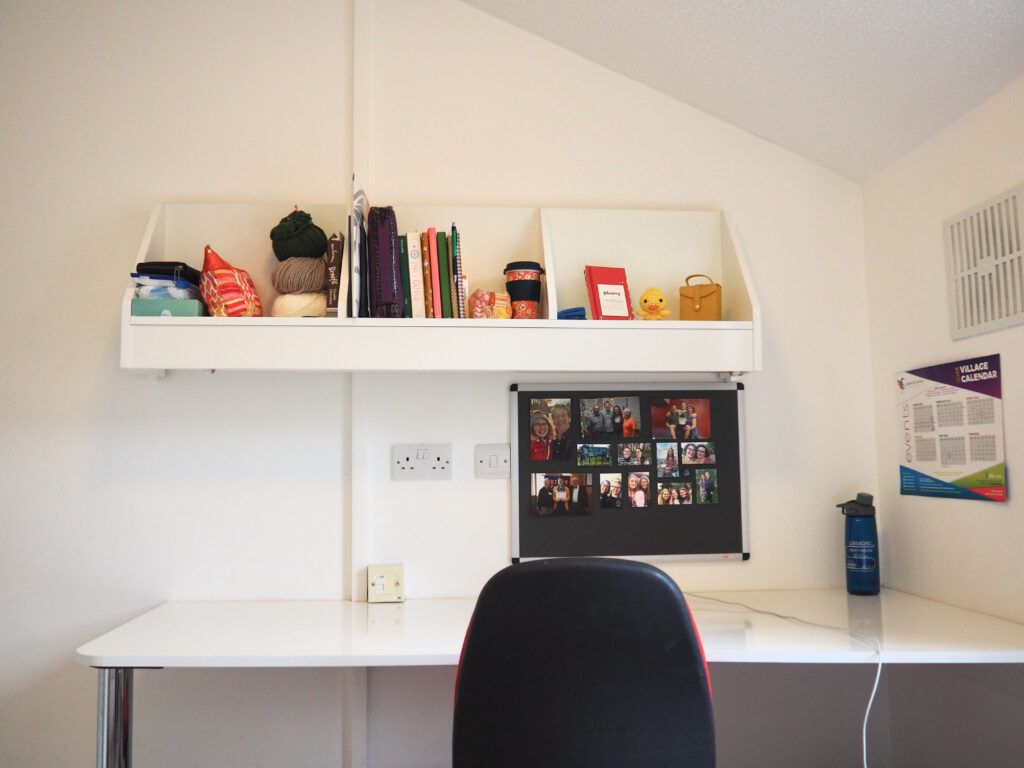 My bedroom is furnished with a desk, chair, shelf, bulletin board, twin-size bed, sink, mirror, towel ring, and wardrobe. The desk is big, making it a nice place to do some work. It even has a light hidden under the shelf. The shelf holds my yarn, books, and a few items from home. Under the sink is a place to store different bathroom supplies and above the sink is another light. The wardrobe has a place to hang a few clothes on the left side and shelves on the right. There is an overhead light on the ceiling and another light above the head of the bed. Under the bed, there are three drawers. I use one to store my shoes. All around the bed is a “bed frame” or as I call it, “My little ledges.” The little ledges make an ideal place to set a phone when lounging in bed, watching a Hallmark movie, or FaceTiming a friend. I am a big fan of my room. I find it cozy and I am enjoying all the shelves, drawers, and cabinets.